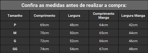 - Formato: Conferir tabela de medidas